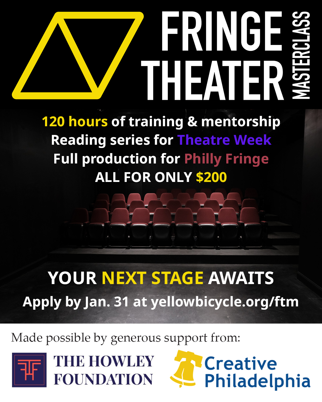 APPLY NOW. Make 2026 the year you stop waiting at home for opportunity to knock and start going out and creating your own opportunities. Your next stage awaits at Yellow Bicycle Theater.